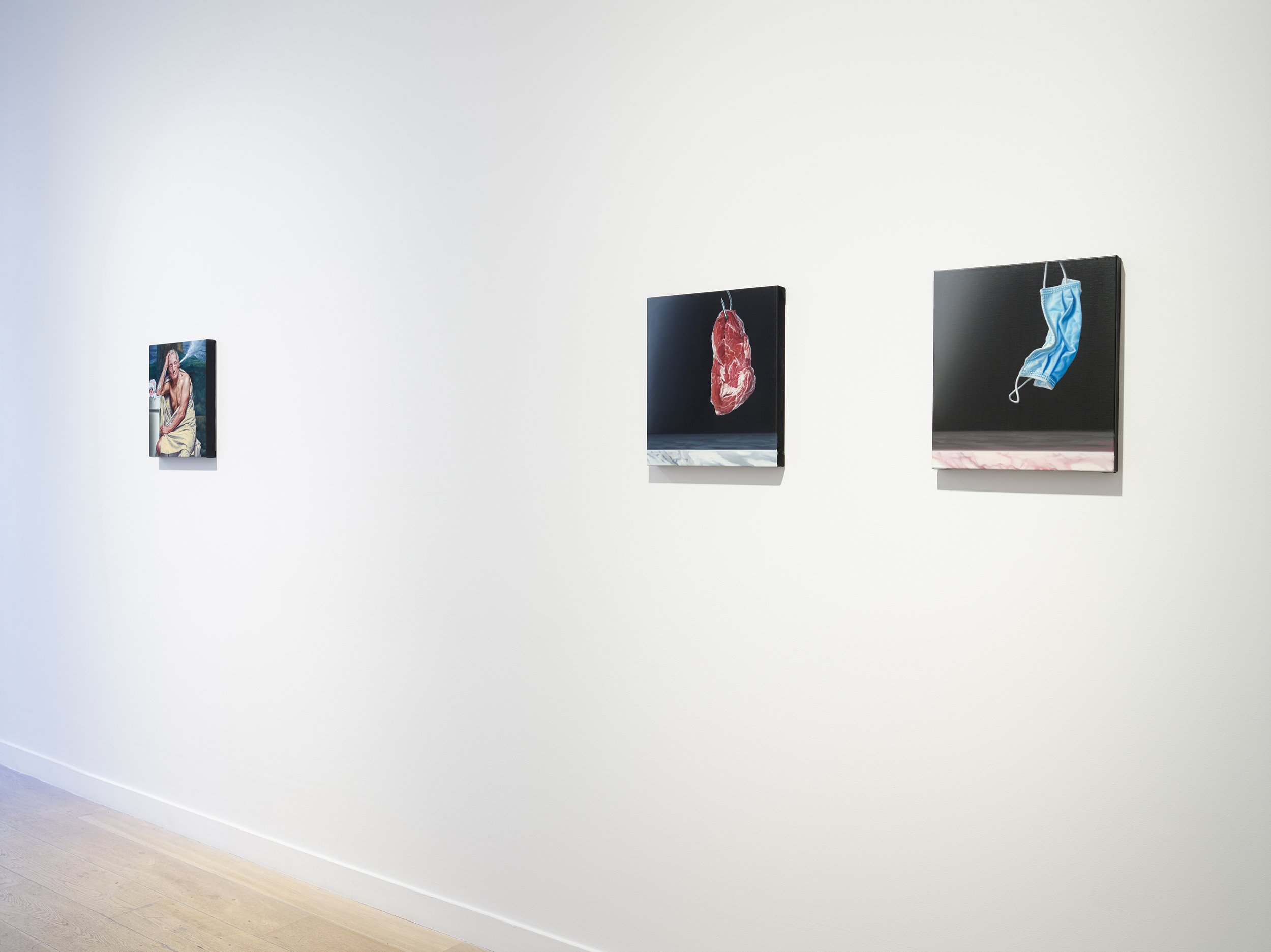 In 2019 Martinec worked with live models, directing and photographing a series of tableaux which, during the pandemic, formed the basis for his new paintings. This exhibition introduces some significant developments within Martinec’s practice. While reflecting Martinec's technical mastery and his ongoing use of photorealist techniques, in a striking formal development and in contrast to his first two exhibitions at the gallery, which featured monochrome and grisaille works, Martinec’s vibrant new paintings are rich with theatrical colour, satirical objects and individuals.